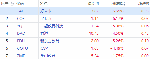 中概教育股集体反弹,好未来(TAL)、51talk(COE)涨超6%,新东方(EDU)涨超5%,高途(GOTU)、有道(DAO)、一起教育科技涨超4%。
