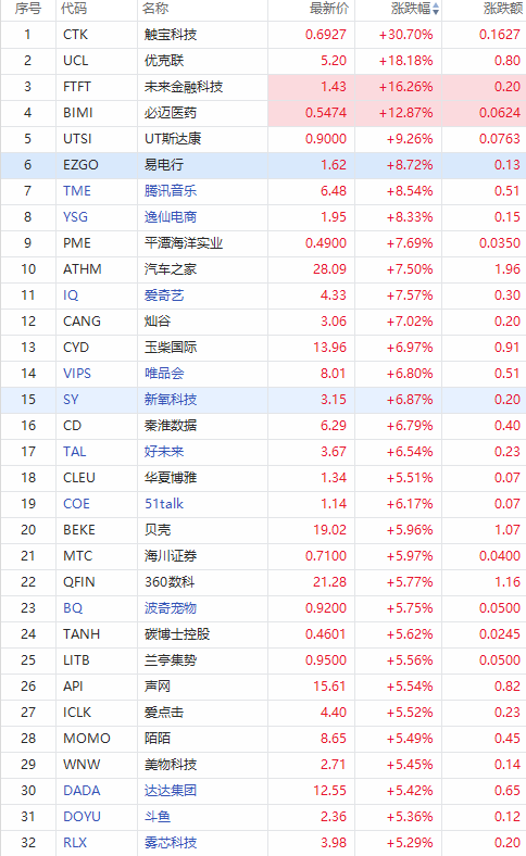 华盛资讯12月30日消息,热门中概股多数走高,触宝科技(CTK)涨超30%,爱奇艺(IQ)、腾讯音乐(TME)涨超8%,唯品会(VIP)涨超6%,贝壳(BEKE)、雾芯科技(RLX)涨5%,阿里巴巴(BABA)涨超5%,京东(JD)涨超4%。