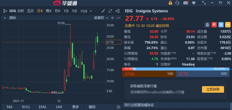 华盛资讯12月30日消息,广告服务公司Insignia Systems $ISIG 涨超20%,该股已经连续三个交易日上涨,本月累涨超400%。该股市值为4910万美元,但成交额已达3.82亿美元。