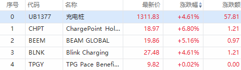 华盛资讯12月30日消息,充电桩概念股集体走高,EVgo Inc $EVGO 涨超10%,Volta $VLTA 涨超6%,Chargepoint Holdings $CHPT 涨超6%,Beam Global $BEEM 涨超5%,Blink Charging $BLNK 涨超4%。