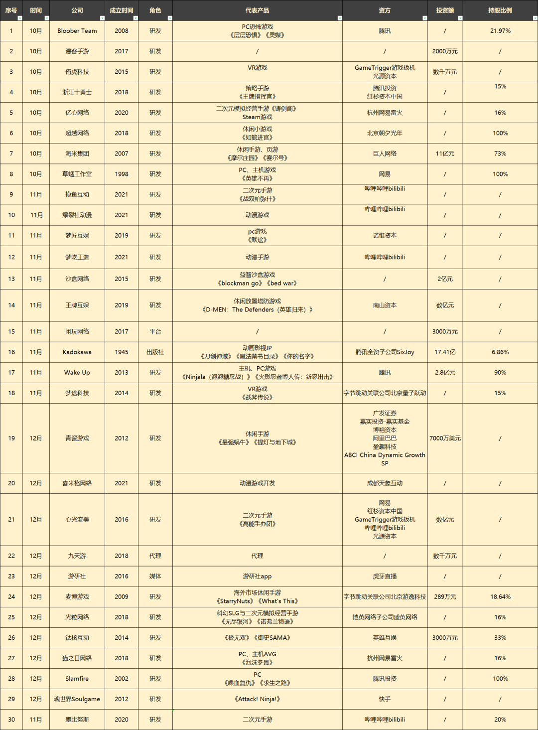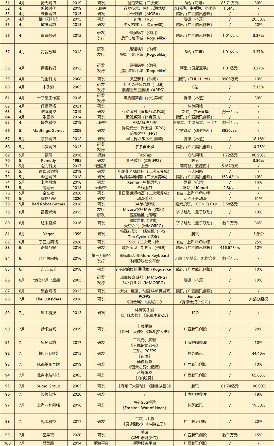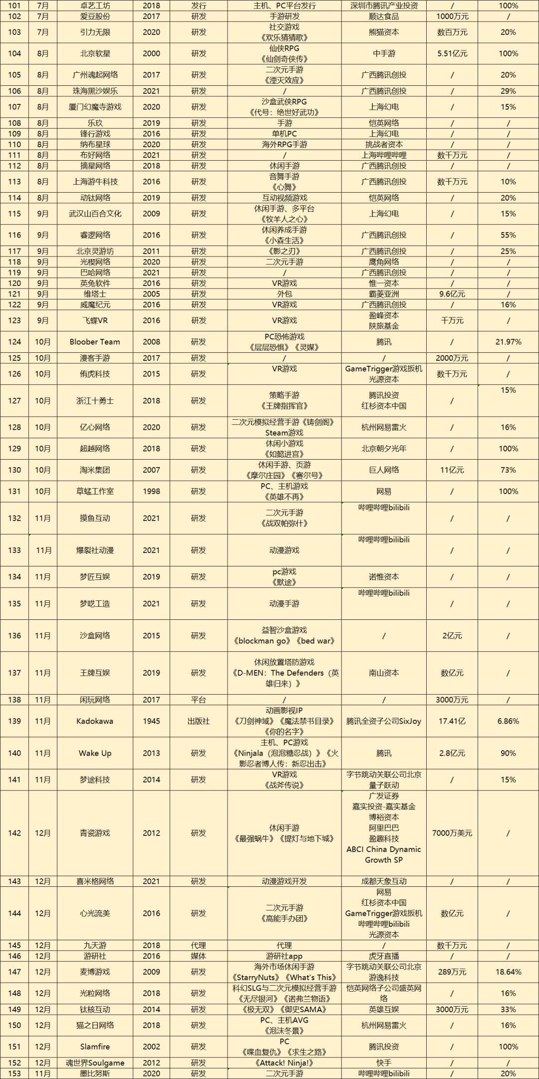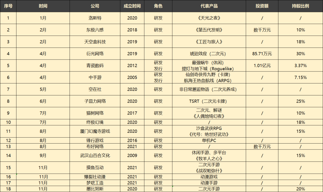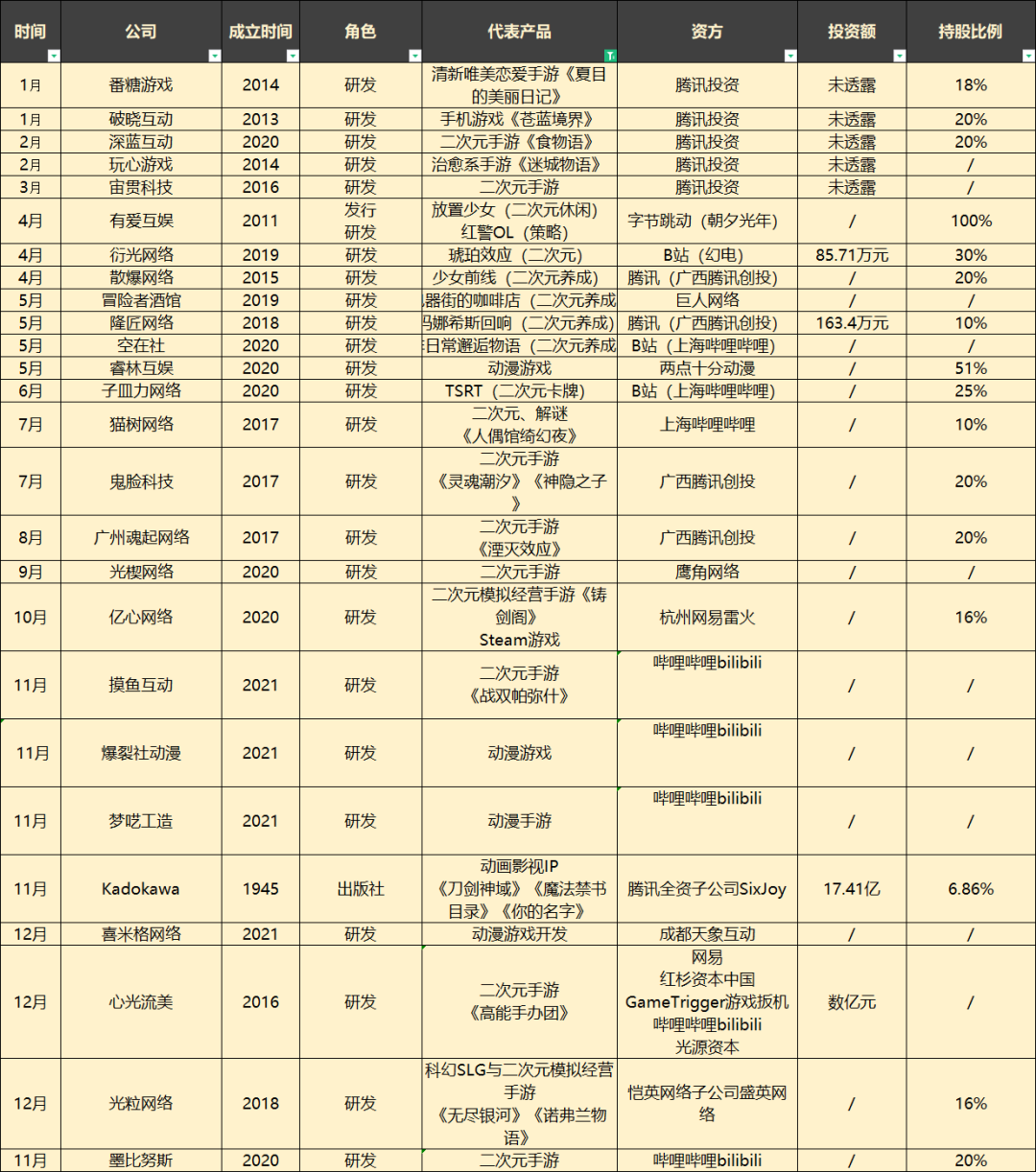 和2020年相似,今年的腾讯还是主投研发,持股比例多在10%以上。不过相较2020年更宽泛的投资选择,他们今年更集中在二次元、女性向、多平台能力几个方面,押宝,还是传统艺能。