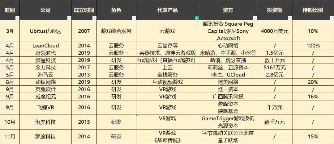 其中云游戏相关有5家,包括上云、云储存等服务,如蔚领时代、海马云等都已经在游戏圈拿到过多轮投资。其次是VR,也有5家,多是2016年前后生存下来的VR创业公司,已有自己的技术壁垒和较成熟的产品。