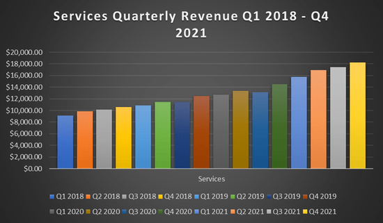 在以前的文章中,我曾写过苹果如何类似于一家成长型公司,尽管它是标普500指数中最大的公司。2021年苹果的年收入增加了913亿美元(33.26%),由于2021年额外产生478.8亿美元,苹果的毛利润增加了45.62%。苹果也是标准普尔500指数中最赚钱的公司,因为它创造了946.8亿美元的净收入。苹果预计将实现收入的环比增长,并在假日季节创下新的季度收入记录,因为他们看到了对其产品的强劲需求。