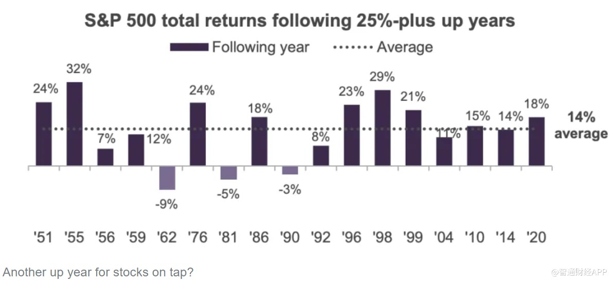 周五,Truist Advisory Services联席首席投资官Keith Lerner称,追溯至1950年,当标普500指数年回报率至少为25%时,股市通常会在次年上涨。在这71年中,82%的情况下美股在年涨幅超过25%后会在次年上涨,即17次中有14次出现这种情况。