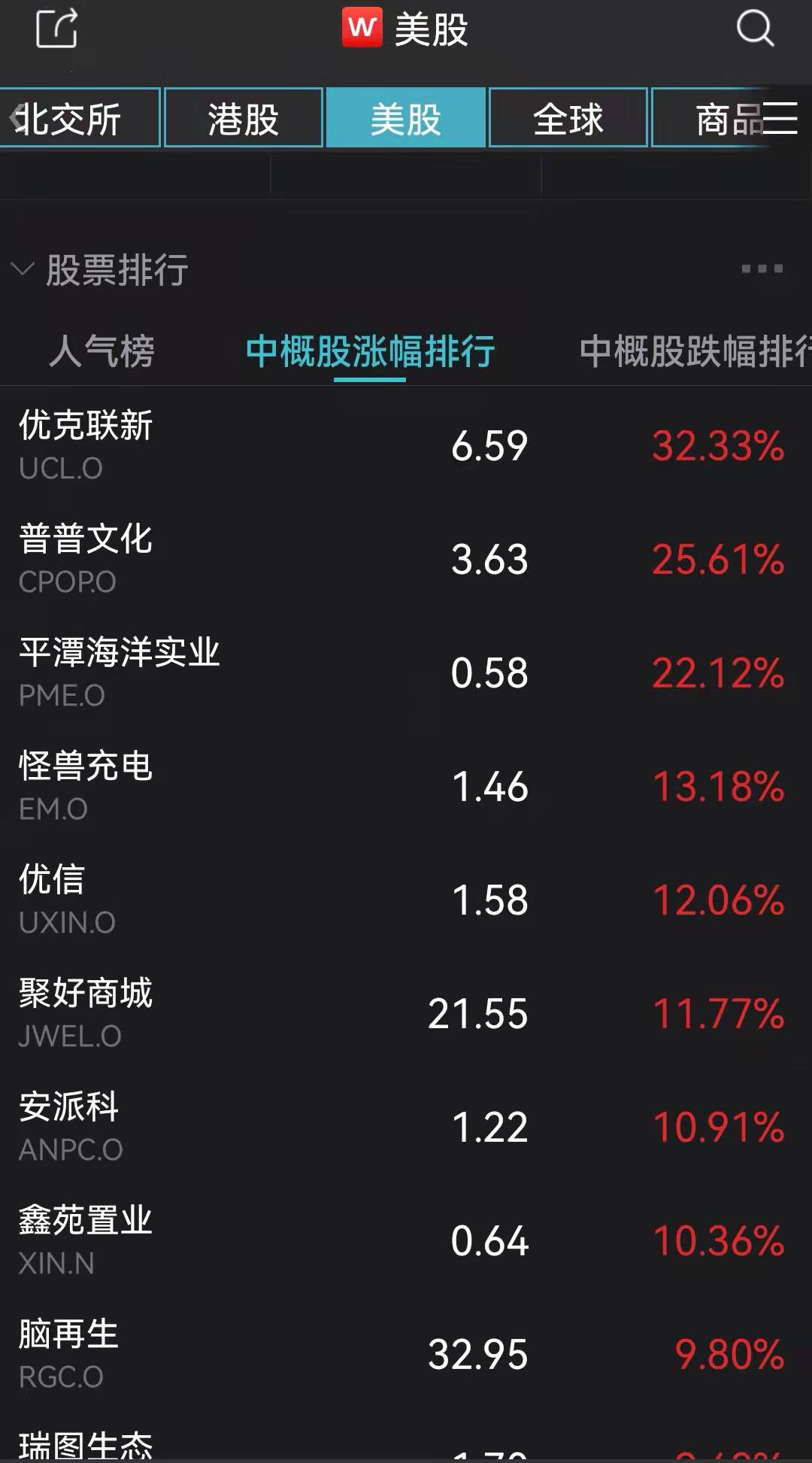 中概股方面,优客联新涨32.33%,普普文化涨25.61%,聚好商城涨11.77%,脑再生涨9.8%,每日优鲜涨9.39%,有道涨7.57%;魔线跌17.82%,触宝跌14.5%,亚洲时代跌12.91%,联代科技跌12.46%,掌门教育跌10.47%,雾芯科技跌6.71%。