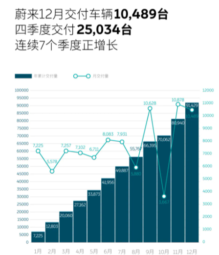 据蔚来汽车官方微信2022年1月1日消息,2021年12月,蔚来交付新车10,489台,同比增长49.7%。四季度共交付25,034台,同比增长44.3%,实现连续七个季度正增长。