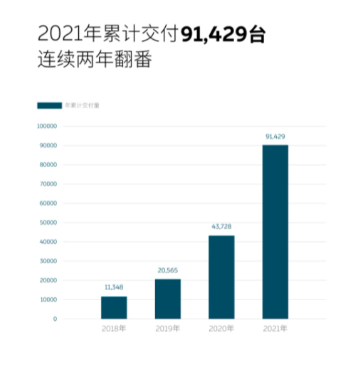 蔚来2021年交付新车91,429台,同比增长109.1%,连续两年翻番。蔚来车辆累计已交付167,070台。