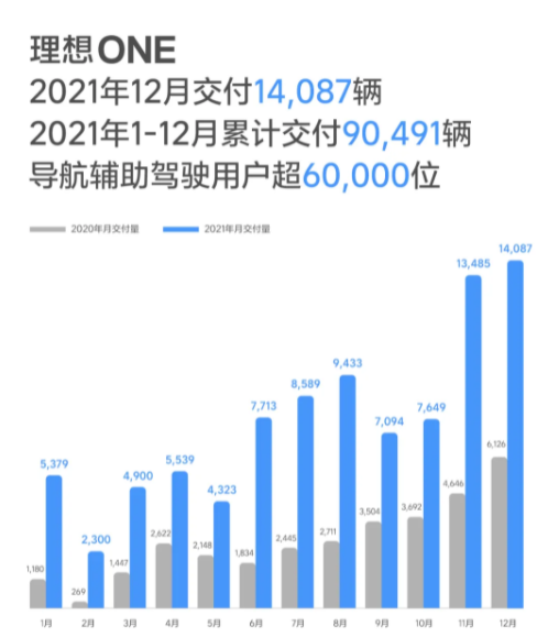 2022年1月1日,理想汽车公布2021年12月交付数据。2021年12月,理想汽车交付14,087辆理想ONE,同比2020年12月增长130.0%。2021年第四季度,理想ONE共交付35,221辆,环比2021年第三季度增长40.2%,同比2020年第四季度增长143.5%。2021年1月至12月,理想ONE总计交付90,491辆,同比2020年增长177.4%。