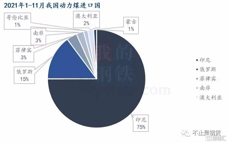 2021年1-11月我国动力煤进口国分布:印尼75%、俄罗斯15%、菲律宾3%、南非3%、澳大利亚2%、哥伦比亚1%、蒙古1%。我国煤炭进口依赖度约10%。