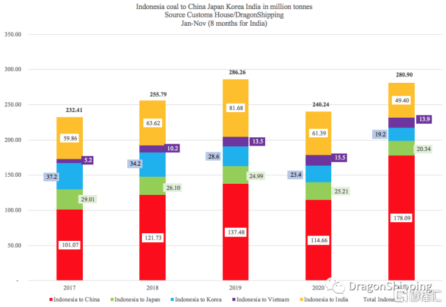 澳大利亚1-11月份对以上5国煤炭出口减少2206万吨,为2.3627亿吨。其中,中国海关接受报关807万吨(估计为保税区报关),去年同期为7844万吨;日本1.0898亿吨,去年同期为9376万吨;韩国5530万吨,去年同期为4200万吨;越南1420万吨,去年同期为1850万吨;印度1-8月份进口澳大利亚煤炭4970万吨,而去年同期仅为2567万吨。