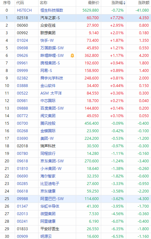 汽车之家涨超7%领涨成分股,联想集团、众安在线涨超2%,快手、哔哩哔哩涨超1%。