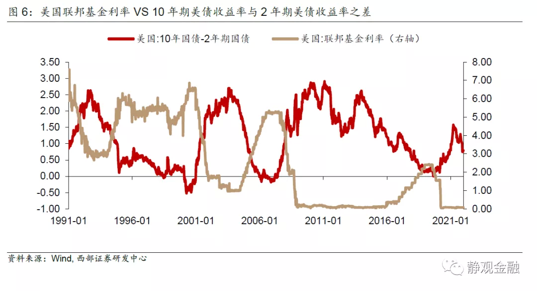 疫情不仅对美股形成了非常规影响,也令很多资产表现出极端走势。如图3所示,长期看,恒生指数与LME铜走势呈现正相关特征,但疫后二者背离明显;进一步看,如图4所示,恒生指数与LME铜价比值跟美元指数呈现正相关特征,但疫后二者发生了背离。如图5所示,长期看,MSCI发达市场指数与MSCI新兴市场指数之比同美元指数也是趋势正相关,但疫后前者创出2003年后新高、后者则中枢下移。再者,结合图6可知,1990年至疫前美联储历次加息(或者加息预期形成)前,10年期与2年期美债收益率差值均会触及2%(上方),而12月议息会议上美联储已经给出今年加息三次的前瞻指引但2021年10年期与2年期美债收益率差值高点仅为1.58%(3月20日)。