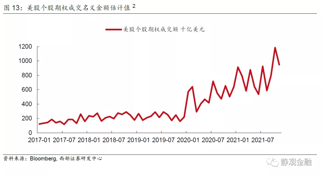 与彼时类似,疫后也有超乎寻常的大量资金涌入美股市场。差别在于疫后这些资金的涌入并非类似亚洲金融危机后的全球投资者抱团行为,而是财政转移支付令居民获得大量无成本资金以及疫后民众获得大量空闲共振之下极大地刺激了美国本土投资者对于交易美股的热情。如图12所示,截止2021年10月底美股个股期权成交量名义值(1.19万亿美元)接近疫前的6倍(0.22万亿美元)。尽管2021年9月6日美国已经彻底结束财政转移支付,但财政转移支付行为令2020年初至今美国个人储蓄多增了2.48万亿美元。这笔钱仍然支持美国个人投资者通过交易个股期权推升美股风险偏好。