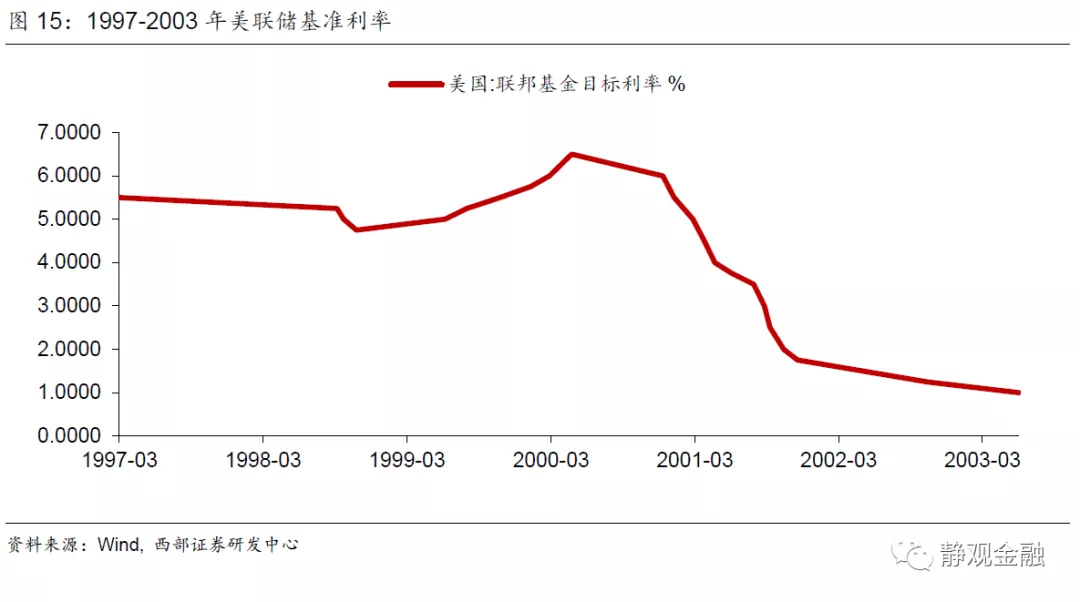 2000年纳斯达克泡沫破灭既有基本面因素也有美联储推波助澜。2000年4月以微软被判违反《反垄断法》[3]为标志性事件,互联网企业开始进入泡沫破灭期,环球通讯公司等互联网企业相继破产倒闭。与此同时,美联储在亚洲金融危机期间短暂降息后于1999年6月重新开始加息,且在连续四次每次加息25BP后于2000年5月一次性加息50BP。结合图11可知,随着美联储加息推进,海外投资者对美股的净买入规模于2000年2月见顶,而纳斯达克指数于2000年3月初见顶。