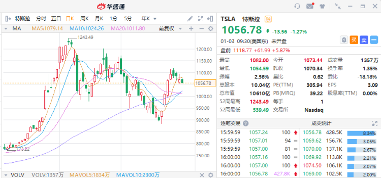 华盛资讯1月3日消息,美股盘前,特斯拉(TSLA)涨近6%,公司四季度交付量创纪录,2021年全年累计交付93.6万辆。