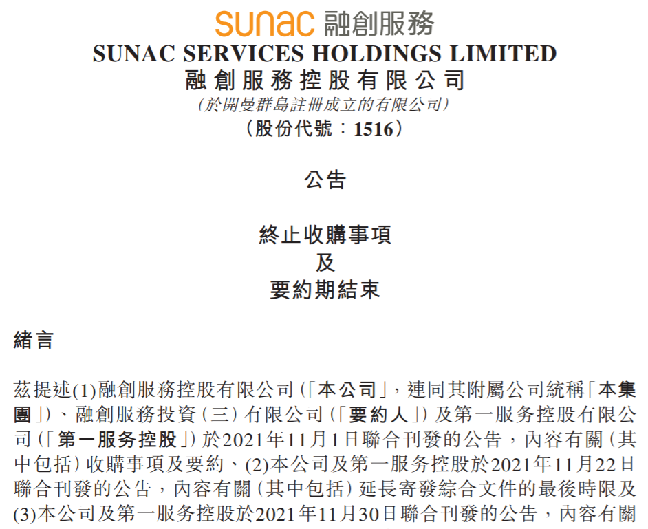 对于终止原因,融创服务在公告中称,自2021年10月7日各方订立股份转让协议后,融创服务立即开展了对第一服务控股的尽调工作,且要约人已将收购事项及要约所需的全部资金人民币22.67亿元存入与财务顾问共同监管的账户。