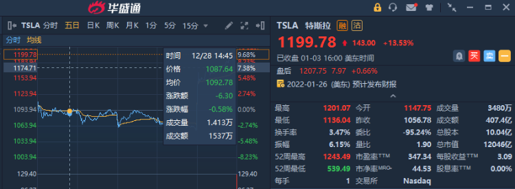科技股领涨,苹果市值一度超过3万亿美元,特斯拉大涨13.5%。投资者继续关注奥密克戎变异毒株带来的不确定性因素。