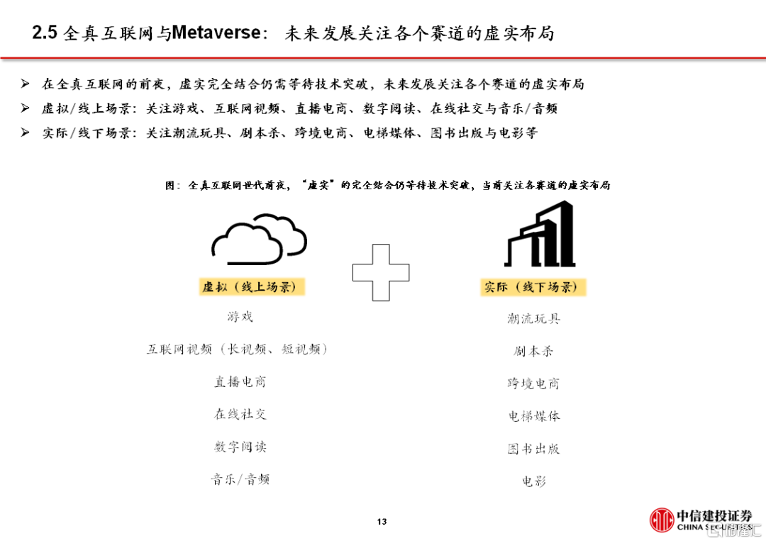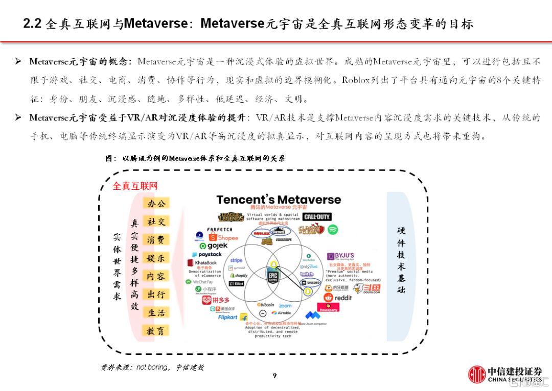 沙盒游戏由于其底层逻辑开放、玩法自由,提供社交空间,符合Metaverse多样性、身份和朋友的基本逻辑,最接近元宇宙概念。社交元宇宙亦是目前已形成体系的元宇宙形态:以Soul为代表的社交元宇宙,可以为用户提供陌生人社交虚拟身份进行即时社交。未来Metaverse元宇宙的变革即是在技术支撑的基础上,如何创作更多样的虚拟世界内容,以更真实的方式呈现,更便捷高效地满足实体世界的需求。这一变革将从游戏和社交作为起点,在实体和虚拟世界的内容和消费需求上进行大量布局,最终构建出一个覆盖用户需求的元宇宙。我们认为长远需要关注的是各个内容和消费行业实虚上的布局和打通。