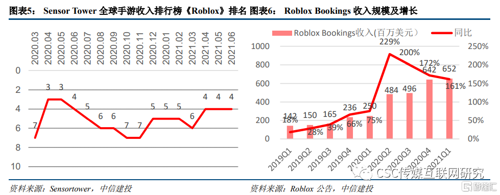 《Roblox》在海外流水和用户量均处于头部梯队,截至2021Q1,Roblox全球日活达到4200万人,游戏总时长达到96.74亿小时。根据Sensor Tower 2021年6月的全球热门移动游戏收入TOP10,《Roblox》移动端流水位居全渠道第四(iOS端第三,Google Play第8)。受流水带动,近两年来,公司Bookings收入(即充值虚拟货币Robux,对应国服的“罗宝”)持续保持快速增长。