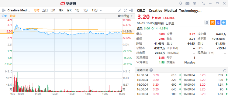生物技术公司Creative Medical Technology周一股价大涨,盘中涨幅一度超过70%,收盘上涨44.80%,全天成交额2.19亿美元,大幅超过前一日321万美元的成交额。该股在消息面上无重大消息,但是一举跃升为当日社交媒体上散户讨论热股,投资者在推特上热情地讨论该股。