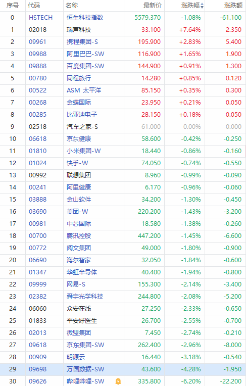 哔哩哔哩跌超6%领跌恒生科指,万国数据跌超4%,京东、网易跌超2%,美团、腾讯跌超1%。