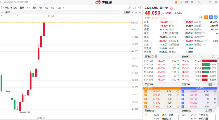 华盛资讯1月4日消息,次新股固生堂延续强势上涨行情,大幅拉升涨8.34%,最高报49.55港元再创历史新高,10个交易日股价翻倍,总市值超110亿港元。公司中医师数量、线下医疗机构数量,及线下机构城市覆盖数量均为行业第一。