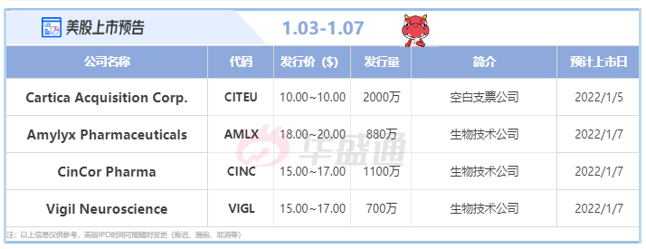 本周市场预计将迎来4只新股(周一无美股新股上市),其中为1家空白支票公司和3家生物技术相关的公司。