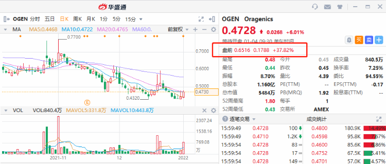 华盛资讯1月4日消息,美股盘前,生物制药公司Oragenics(OGEN)大涨近38%,公司文件报告董事Robert Koski以每股0.47美元的平均价格购买其100万股股票。
