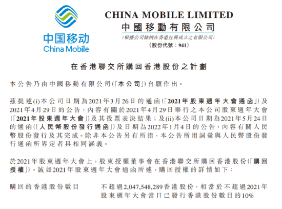 中国移动1月4日在港交所发布公告称,鉴于人民币股份发行已经完成,在人民币股份发行超额配售选择权行使期于2022年2月7日届满后,且在符合所有适用法律、规则及法规的前提下,公司计划行使其于购回授权下的权力在香港联交所场内购回香港股份。上述计划已经获董事会通过。