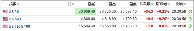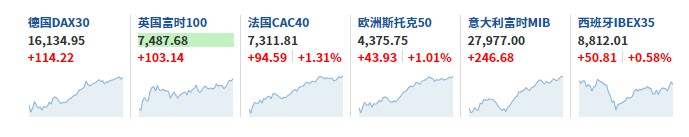 2. 截至发稿,英国富时100指数涨1.4%,德国DAX指数涨0.75%,法国CAC40指数涨1.31%,欧洲斯托克50指数涨1.01%。