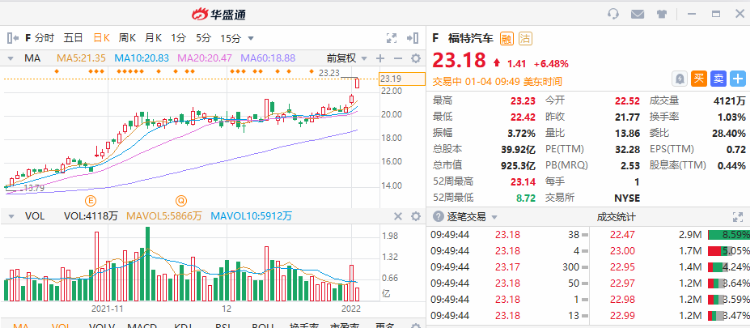 华盛资讯1月4日消息,美股盘初,福特汽车(F)快速走高,截至发稿涨超6%,股价续创历史新高,此前公司计划将全电动F-150闪电皮卡的产量提高近一倍。