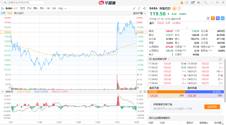受到知名投资人加仓影响,阿里美股股价出现拉升现象,从一度跌3%翻红。截至发稿,盘后涨0.56%,报120.23美元每股。
