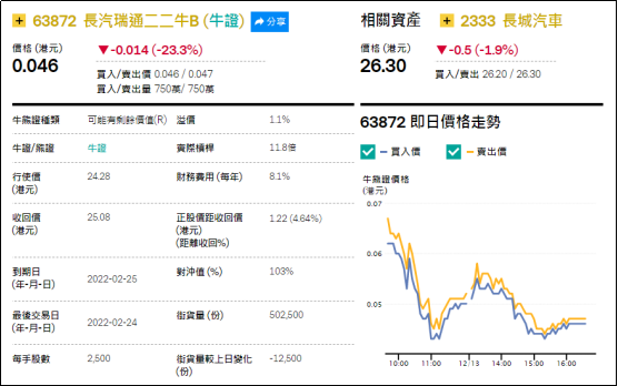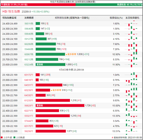 街货分布方面,至周二,恒指牛证街货重货区在收回价22300点至22700点之间,累计相当约4,984张期指合约;恒指熊证街货重货区在收回价23600点至24100点之间,累计相当约4,312张期指合约。