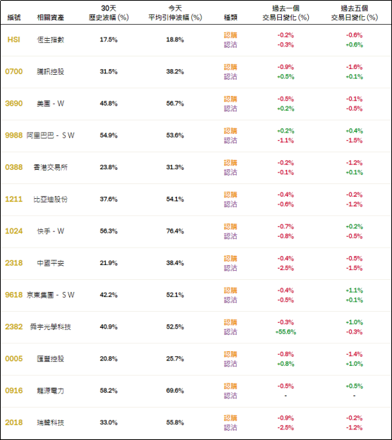 周二恒指相关权证的平均引伸波幅约18.8%,按日略有调低。个股方面,港交所、比迪、快手、平安、京东集团及瑞声科技等相关认购证及认沽证的引申波幅按日均有所调降,舜宇光学科技的相关认沽证的引申波幅则按日调升明显。