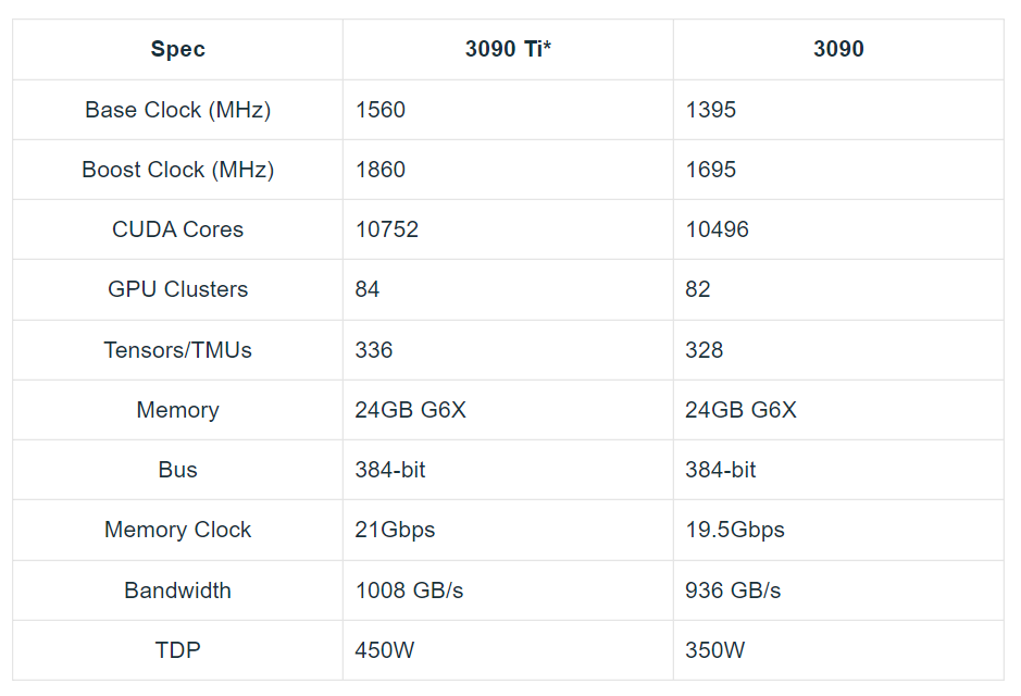 上图为此次大会之前外媒关于3090 TI的硬件参数预测以及与3090的对比。可以看出,从英伟达已经公布的数据(显存规格、容量、总线)看,表中左列的预测是准确的。