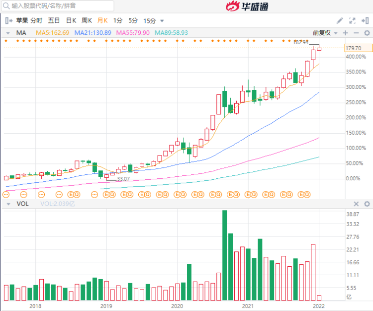 苹果公司股价近几年走势 来源:华盛通