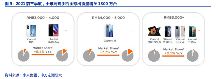 2021年前三季度,小米高端手机全球出货量增至1800万台,出货占比超过12%,高端化战略已初见成效。