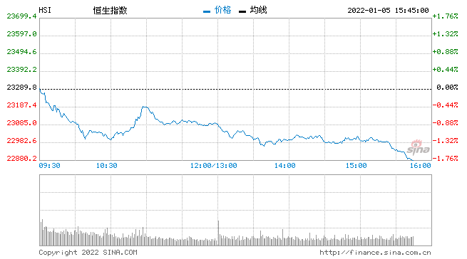 1月5日消息,美国三大股指收盘涨跌不一,国债收益率攀升令科技股承压,纳指跌1.33%,热门中概股集体下跌,今日早盘,恒指高开低走,截至收盘,恒指跌1.64%,报22907.25点,国企指数跌2.01%,红筹指数涨0.47%。
