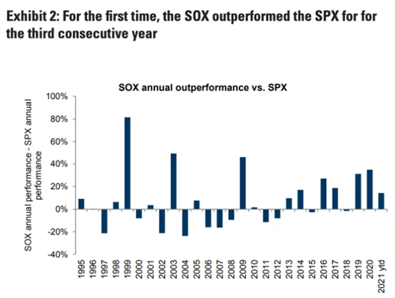 作为疫情时代的赢家,华尔街不少分析师表示,芯片行业在进入2022年后仍将保持强劲势头。不过,他们也发出警告,在2021年整个芯片行业强劲上涨之后,今年芯片类股票的选择将变得更加重要。