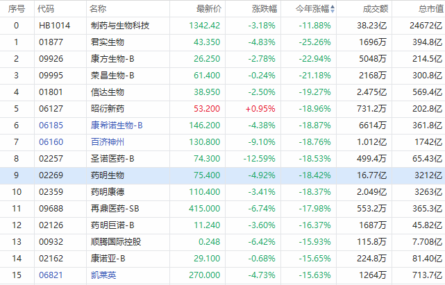 华盛资讯1月6日消息,近期持续下跌的港股生物医药股今日仍未止跌。在今年的4个交易日中,君实生物、康方生物、荣昌生物等累跌超20%;药明生物、百济神州、康希诺生物、昭衍新药等跌幅也超18%。