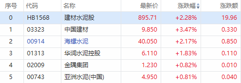 华盛资讯1月6日消息,水泥建材板块普涨,截至发稿,中国建材 $03323.HK 上涨超3%,海螺水泥 $00914.HK 涨超2%,华润水泥 $01313.HK 涨超1%。