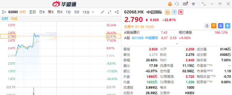 华盛资讯1月6日消息,中铝国际(02068)大幅拉升,一度升超24%,领涨港股通标的。近一个月股价累升67%。截至发稿,中铝国际涨22.91%,报2.79港元/股,成交额0.83亿港元。