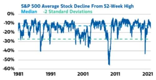 Shalett称,摩根士丹利对标普500指数"谨慎"看法的核心基于市盈率,而市盈率通常在"周期中期转变"期间受到挤压。她在报告中指出了一张图表显示了“股票中值已经经历了中期周期的转变”;下图显示,“标准普尔500指数的股票中值已从52周高点修正了15%”。