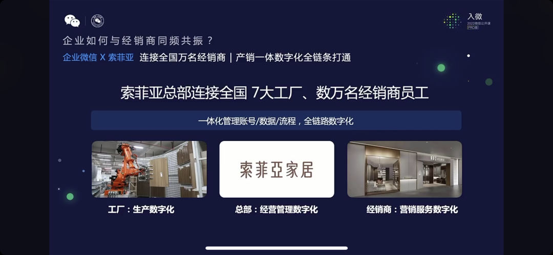 通过企业微信,索菲亚全国百万名经销商,打通了产销数字化全链条。索菲亚总部连接全国 7 大工厂、数万名经销商员工,实现了一体化管理账号、数据、流程。