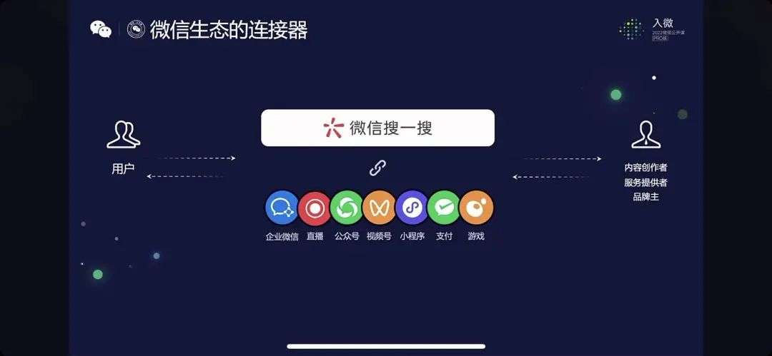 微信公开课讲师周颢分享的内容多少有点「凡尔赛」,但这表达的含义和前面分享的视频号、小程序、支付是相同的,搜一搜应该成为微信生态的连接器,最终达到「用微信,搜所有」的目标。