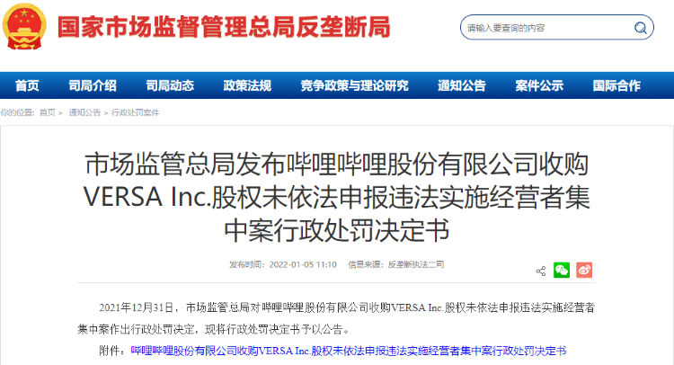 就在昨日(1月5日),根据国家市场监管总局网站的消息,在2021年12月31日,监管总局发布了对哔哩哔哩收购VERSA Inc.(马卡龙)股权未依法申报违法实施经营者集中案的行政处罚决定书,对哔哩哔哩处以50万元的顶格处罚。