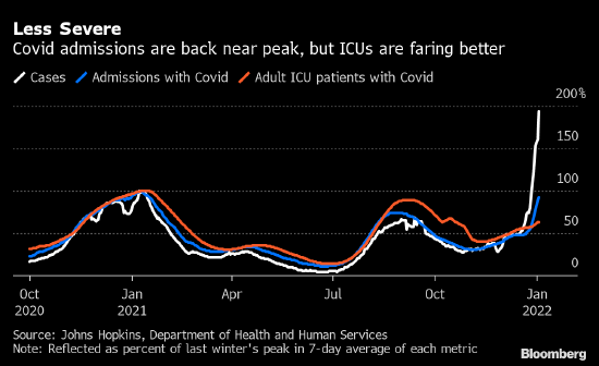 Fogerty和其他医院数据专家表示,一个好消息是,与之前的几波疫情相比,omicron导致的重症患者要少得多,尤其是在疫苗接种率高的地区。