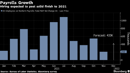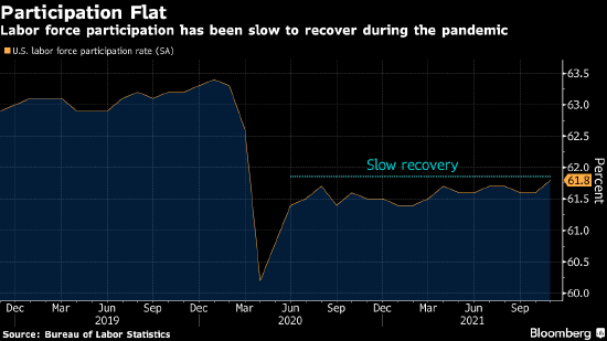 经济学家预测,周五的政府数据预计将显示2021年末非农就业人数新增43.3万,劳动力参与率预计将上升至61.9%,仍远低于疫情爆发前的63.4%。