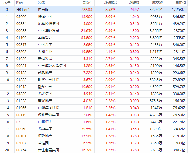 华盛资讯1月7日消息,部分内房股拉升走高。截至发稿,绿城中国涨8%;旭辉控股、中国海外发展涨逾6%;华润置地涨6.07%,报35.8港元每股,成交额3.8亿港元;中国金茂涨4.19%;万科企业涨4.19%;新城发展、越秀地产涨超3%;融创中国、中国恒大、碧桂园跟涨。