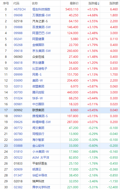 成分股中,万国数据涨超4%,汽车之家、百度集团涨超3%,阿里巴巴涨超2%,京东涨逾1%。